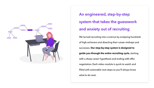 At first glance, I would say there is too much text in both the header and body text of the value prop. Users tend to skim landing pages so it’s imperative the core reasons to purchase the product stand out. Because of this, I would revise the value prop header to read “No more guesswork and anxiety about recruiting.” The phraseology “An engineered, step-by-step system” is jargon users don’t care about and by removing it we highlight the real reason users will want The Career Launchpad— to have “No more guesswork and anxiety about recruiting.”